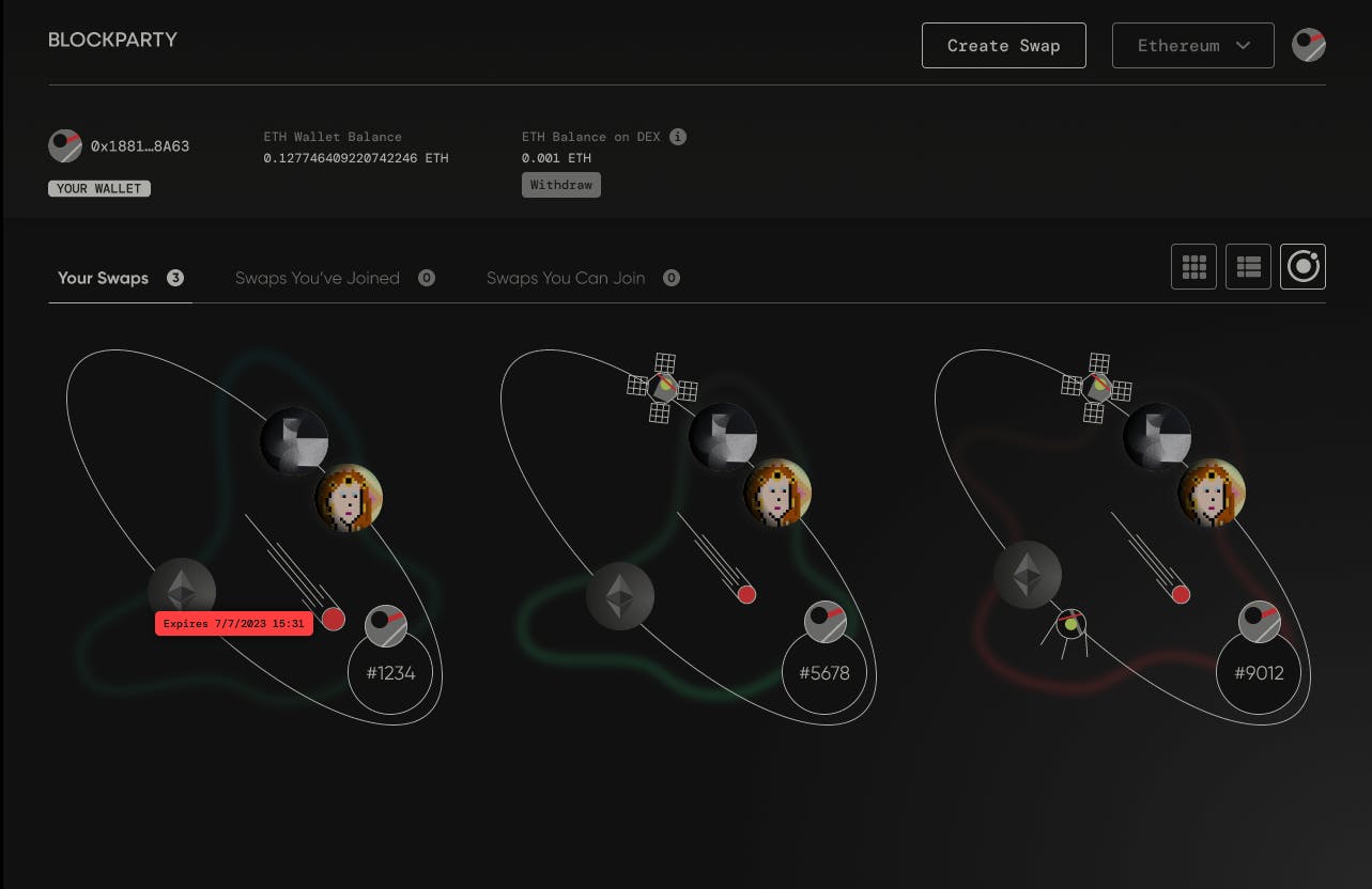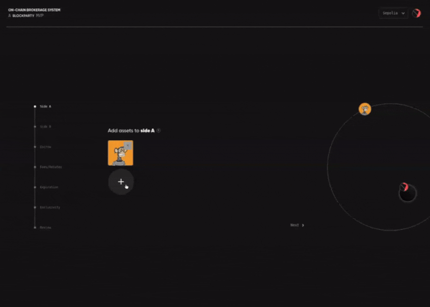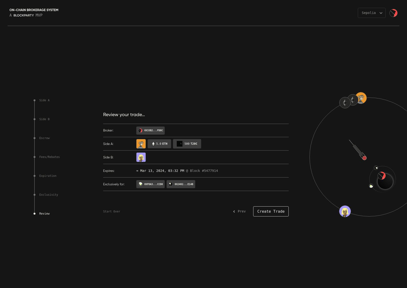 To tackle the complexity head-on, we took inspiration from a DEX we had previously developed (NFT.org DEX), adopting its foundational structures while testing new UI experiments. The core approach: A step-by-step trade creation process, simplifying decision-making for brokers. For the visual representation of trades, we envisioned a solar system UI(a dynamic interface where the trade ID was the "sun," brokers appeared as "moons," and assets and settings orbited like planets and asteroids). This made demystify the intricate mechanics behind each trade.